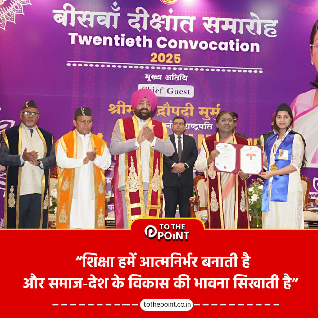 राष्ट्रपति मुर्मु ने कहा, “शिक्षा न केवल हमें आत्मनिर्भर बनाती है, बल्कि हमें विनम्र होना और समाज व देश के विकास में योगदान देना भी सिखाती है।” उन्होंने विद्यार्थियों से आग्रह किया कि वे अपनी शिक्षा को वंचित वर्गों की सेवा और राष्ट्र निर्माण के कार्य में समर्पित करें — यही सच्चा धर्म है, जो उन्हें सच्चा सुख और संतोष प्रदान करेगा।