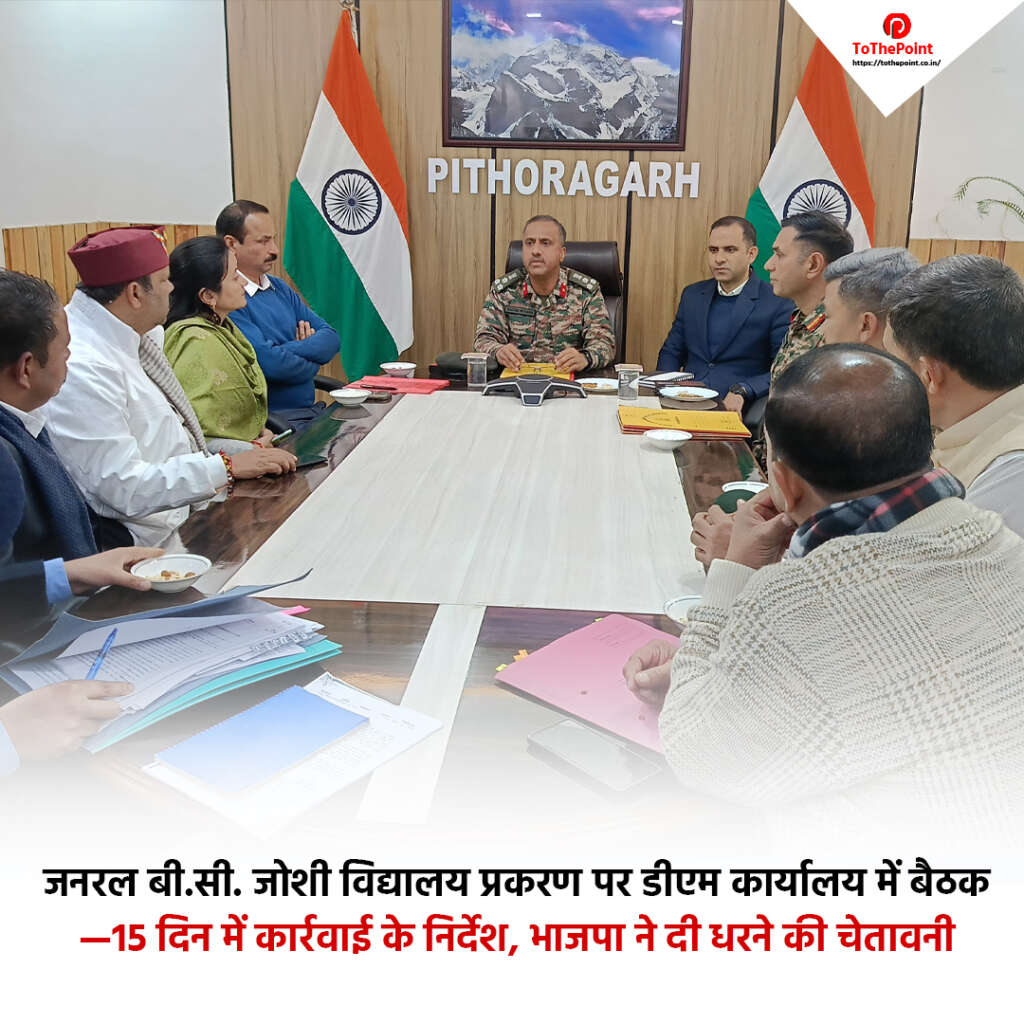 पिथौरागढ़ के जनरल बी.सी. जोशी विद्यालय के प्रधानाचार्य से जुड़े प्रकरण को लेकर आज जिला अधिकारी कार्यालय, पिथौरागढ़ में एक महत्वपूर्ण बैठक आयोजित की गई। बैठक की अध्यक्षता जिला अधिकारी पिथौरागढ़ ने की।