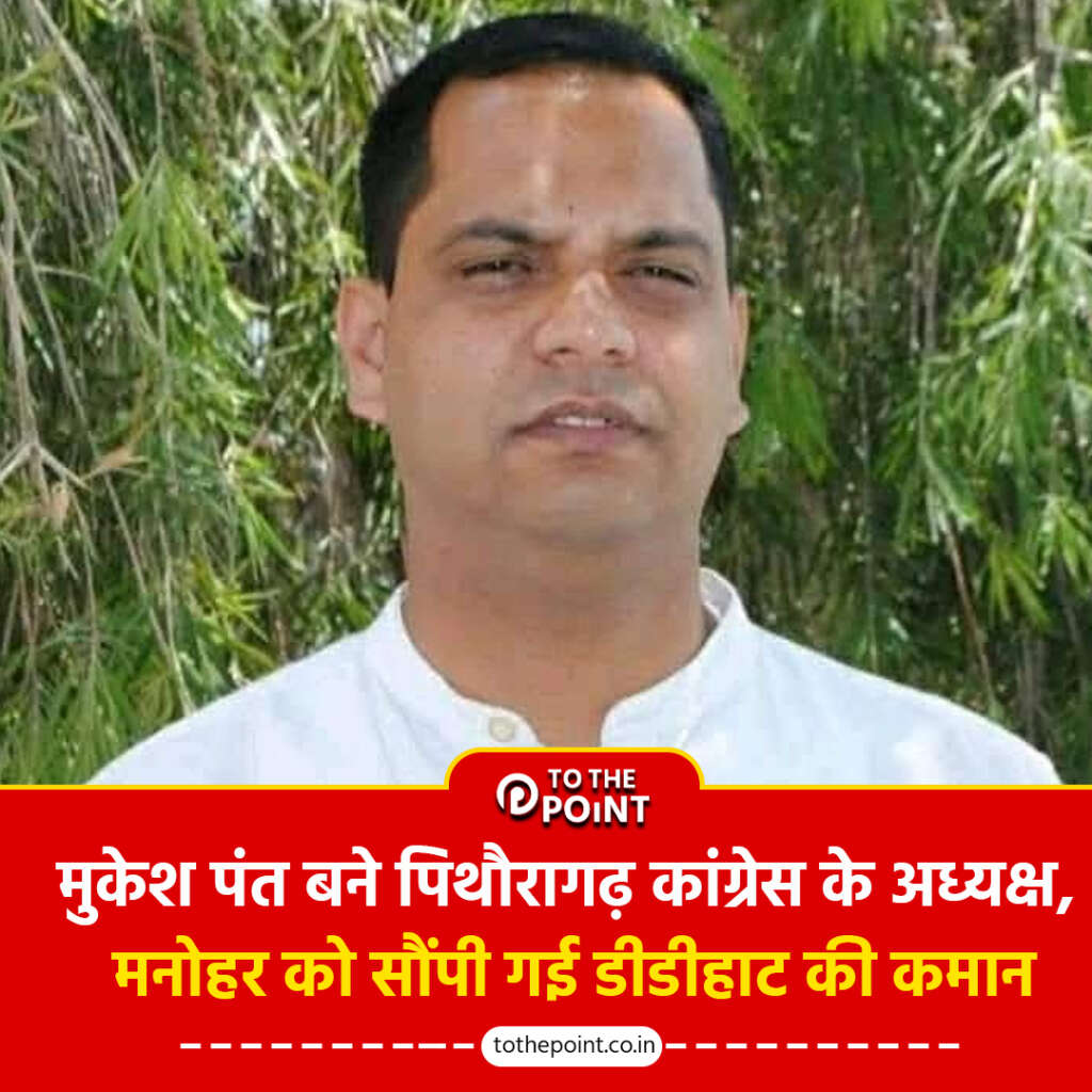 उत्तराखंड कांग्रेस संगठन में बदलाव के तहत मुकेश पंत को पिथौरागढ़ जिला कांग्रेस का नया अध्यक्ष नियुक्त किया गया है। पार्टी आलाकमान के निर्णय के बाद जिलेभर के कार्यकर्ताओं में उत्साह का माहौल है।